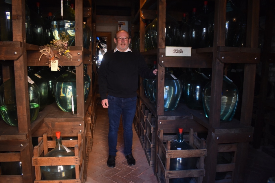 Übrig bleibt die Seele des Brandes, hoch konzentriert und mit 70% Alkohol. Danach wird Wasser zum Destillat gegeben und auf Trinkstärke zu 42% Alkohol heruntergesetzt. Dann erfolgt die Reifung und Lagerung. der fertige Edelbrand lagert in Glasballons und reift mit den Jahreszeiten in Kälte und Hitze. Man trinkt ihn in Weißweingläsern bei Zimmertemperatur damit das volle Aroma zur Geltung kommt.